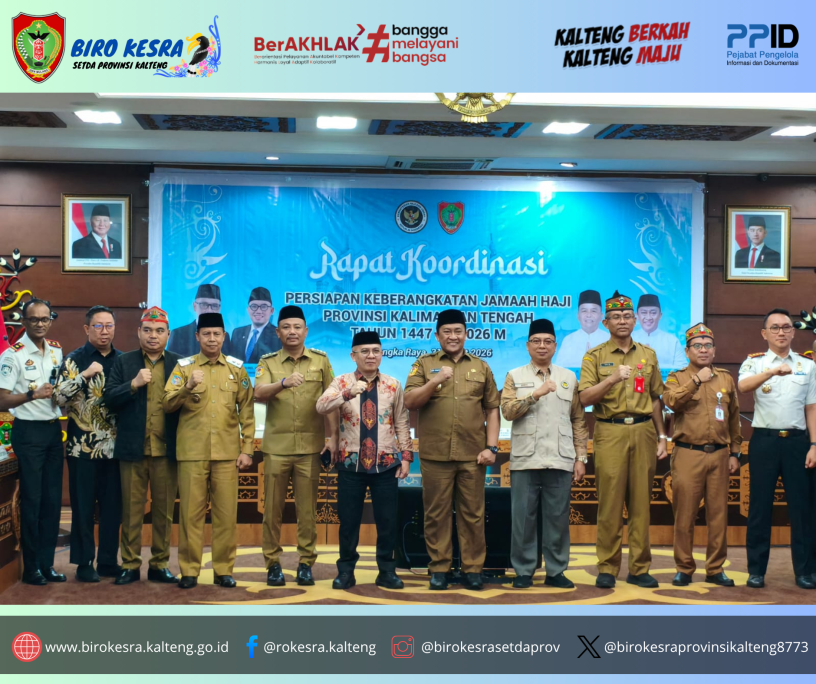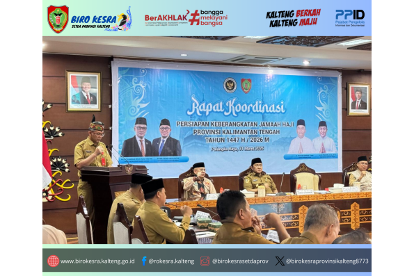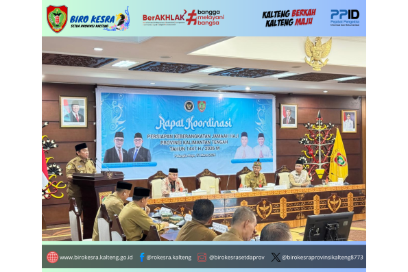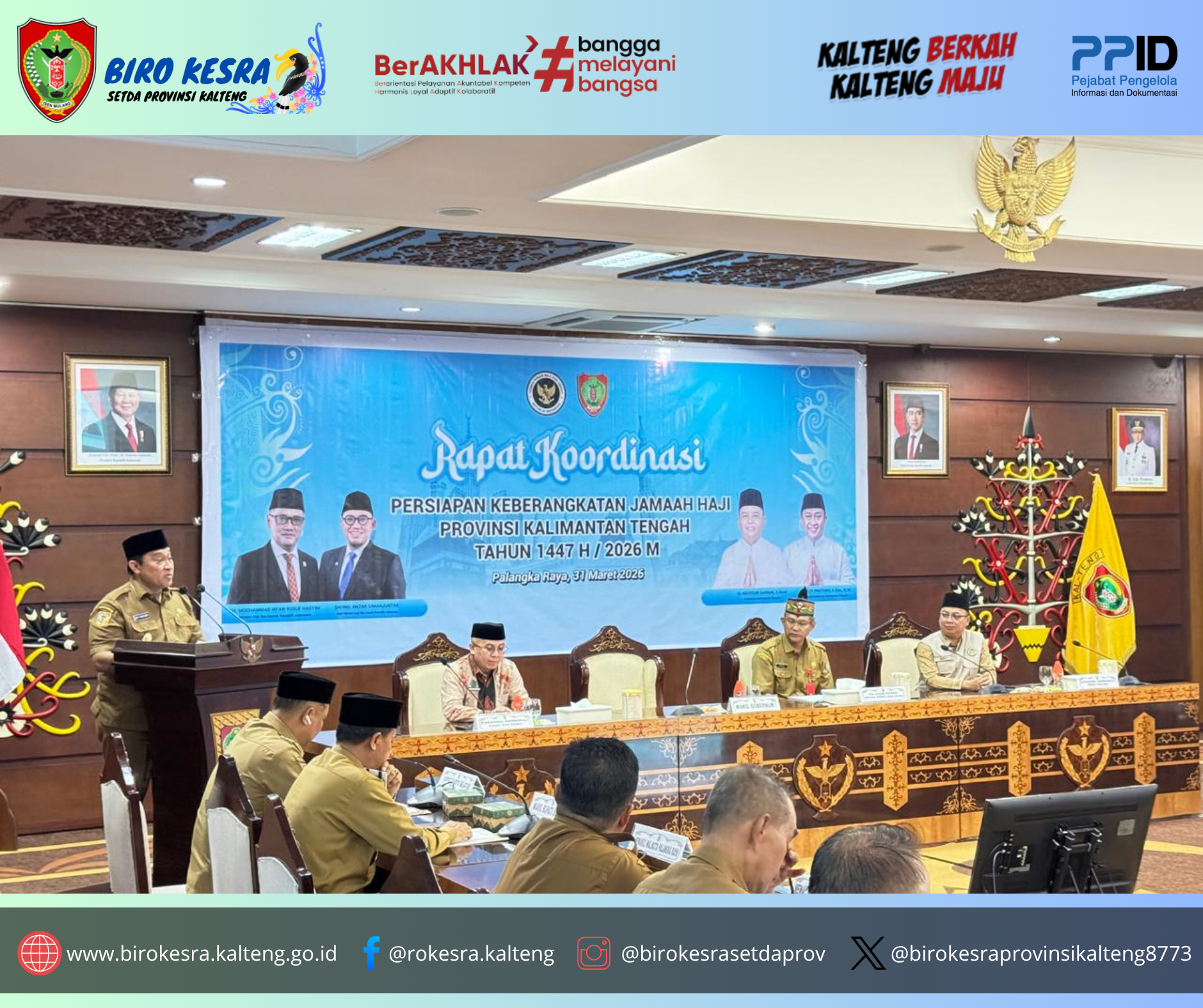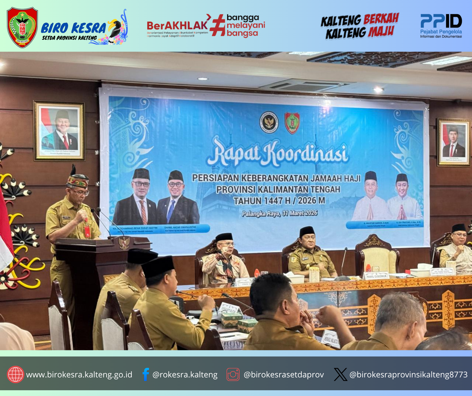 Palangka Raya – Pemerintah Provinsi Kalimantan Tengah melalui Biro Kesejahteraan Rakyat Sekretariat Daerah Provinsi Kalimantan Tengah menggelar Rapat Koordinasi Persiapan Pelaksanaan Keberangkatan Jamaah Haji Provinsi Kalimantan Tengah Tahun 1447 Hijriah/2026 Masehi. Kegiatan ini dilaksanakan di Aula Eka Hapakat Lantai 3, Kantor Gubernur Kalimantan Tengah, Selasa (31/03/2026).