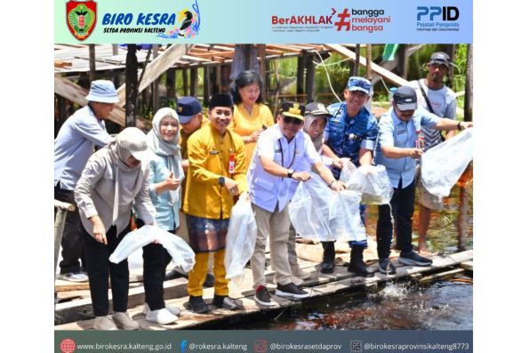 Pangkalan Bun – Plt. Kepala Biro Kesejahteraan Rakyat (Kesra) Setda Provinsi Kalimantan Tengah, Akhmad Husain, mendampingi Gubernur Kalimantan Tengah, H. Agustiar Sabran, dalam kegiatan restocking benih ikan di Sungai Kapitan, Kecamatan Kumai, Kabupaten Kotawaringin Barat, Kamis (2/10/2025).